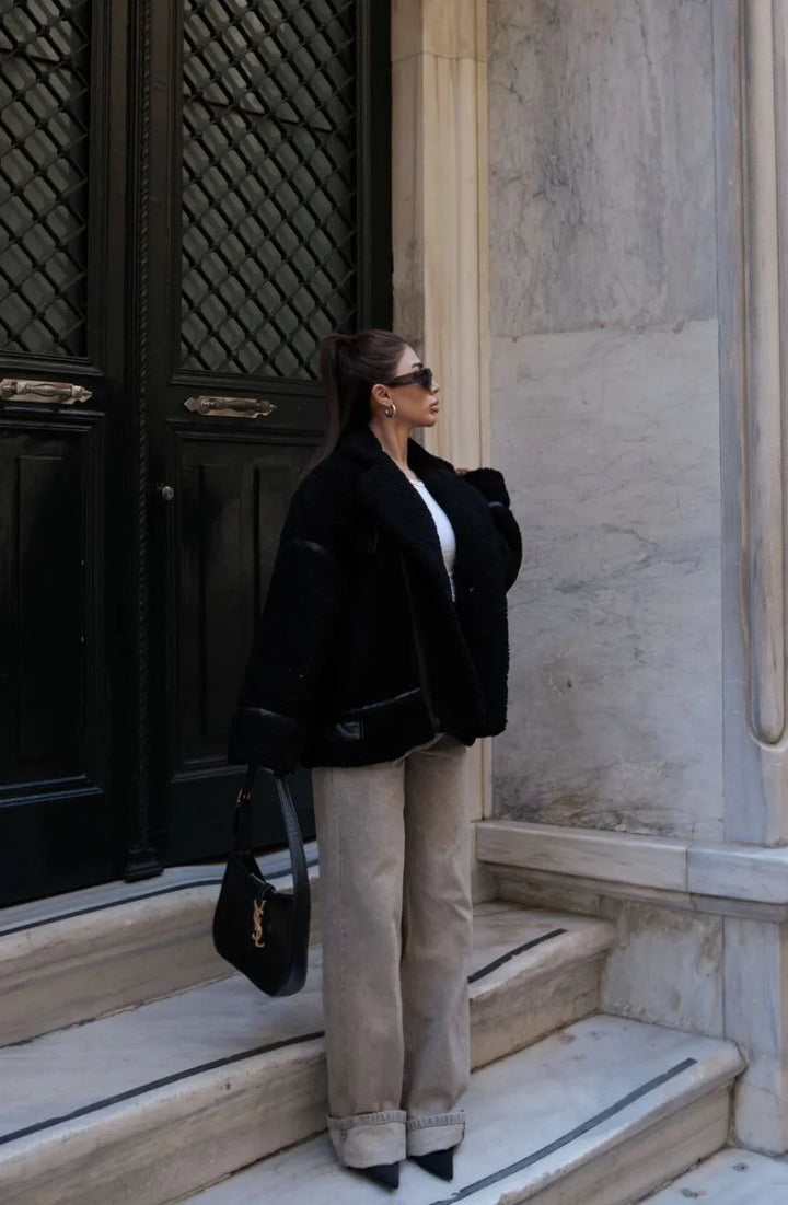 Cıt Cıt Detaylı Peluş Mont Ceket - Siyah