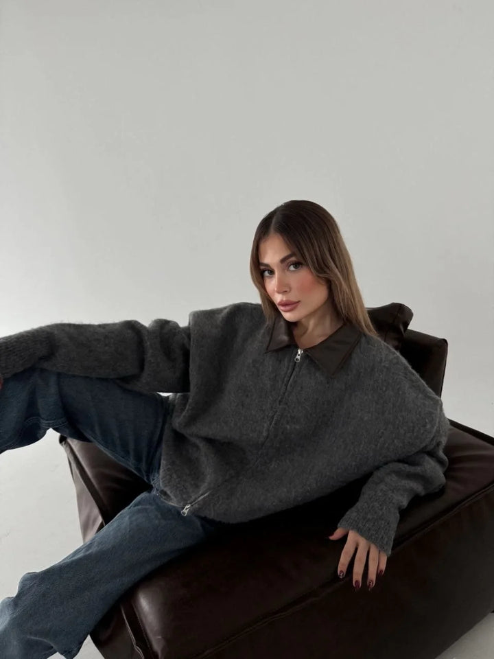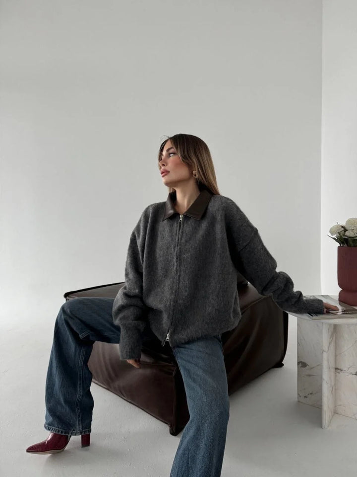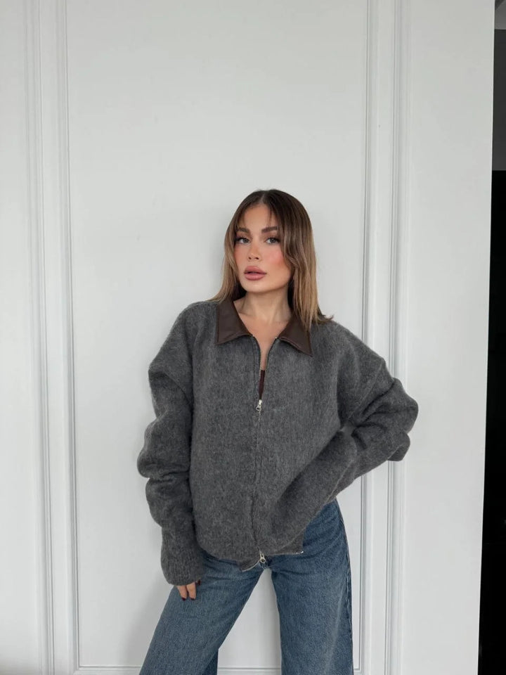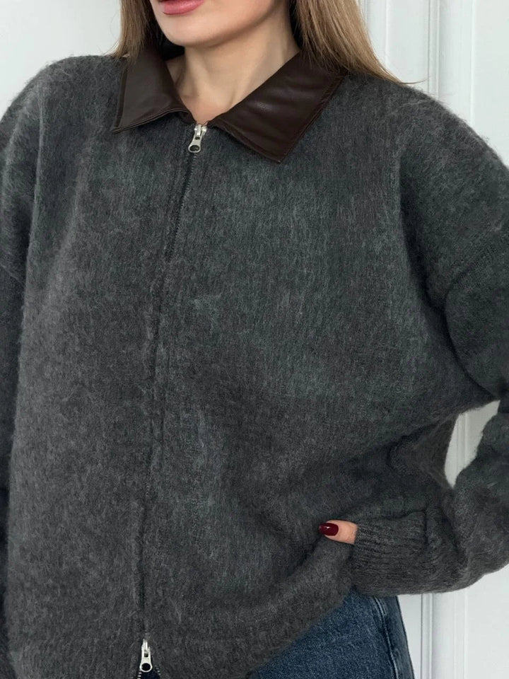 Deri Yakalı Pamuk dokulu Çift Taraflı Çalışan Fermuar Ceket - Füme