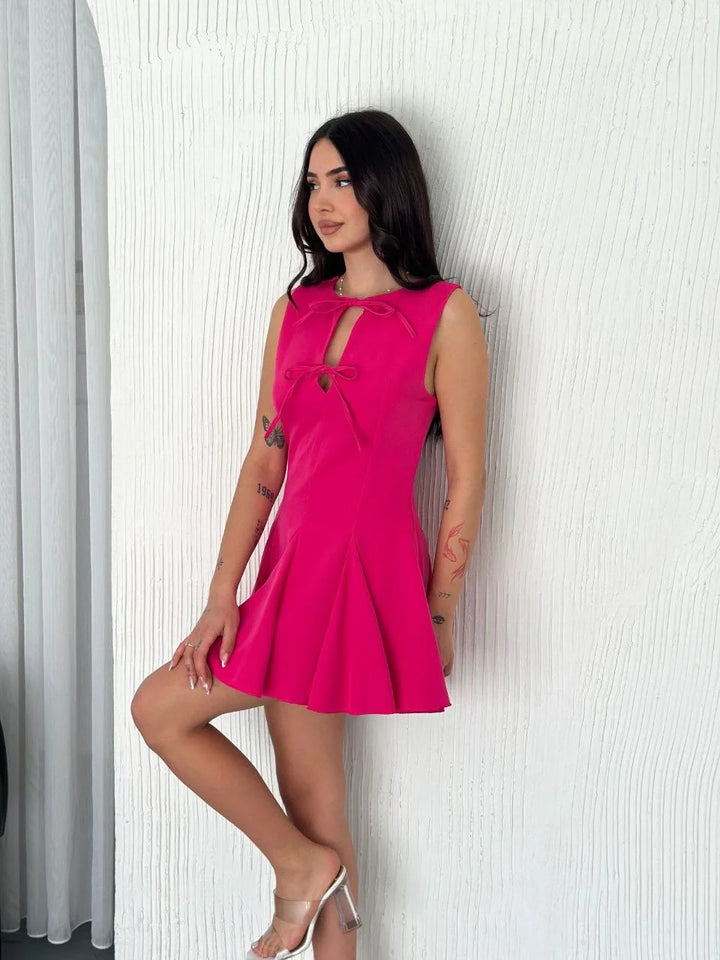 Göğüs Bağlamalı Kolsuz Mini Boy Elbise - Pembe