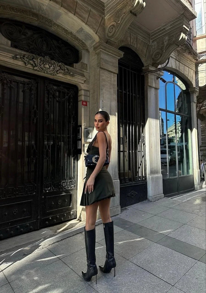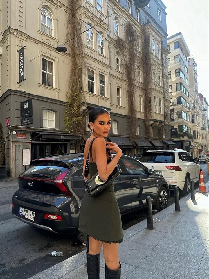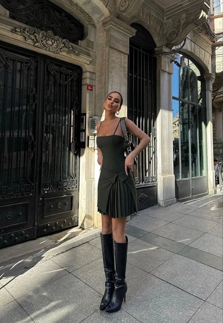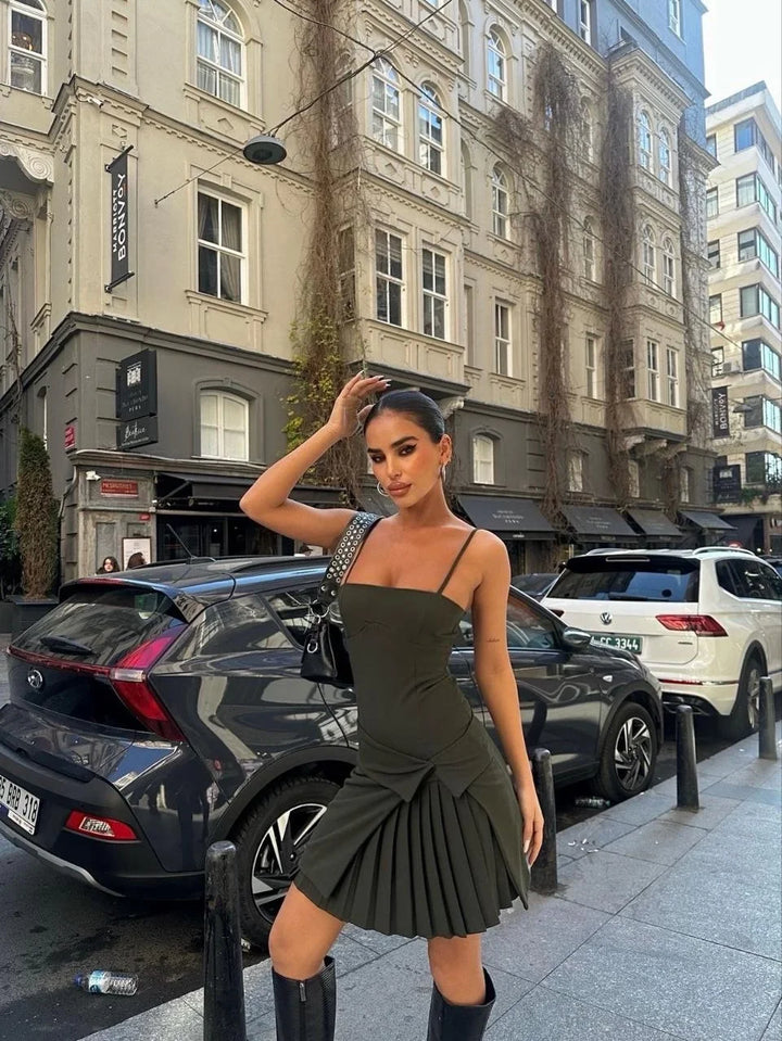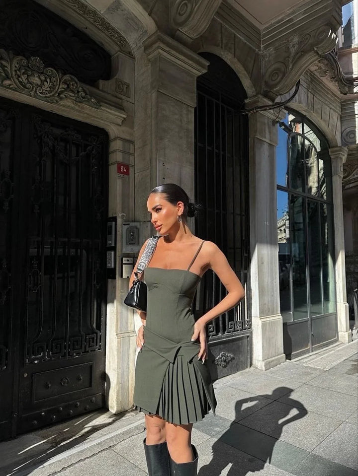 İki Parçalı Pileli Askılı Kadın Mini Elbise - Haki