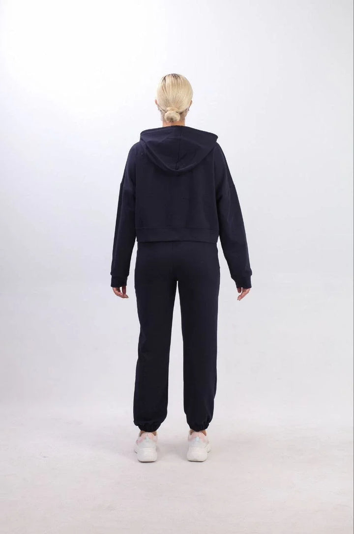 iki iplik Kapüşonlu Fermuarlı Crop Oversize Hırka Takım- Lacivert