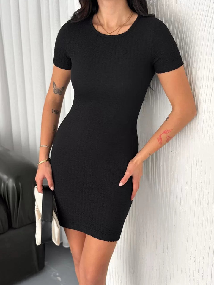 Kadın Bisiklet Yaka Kısa Kol Likralı Elbise - Siyah
