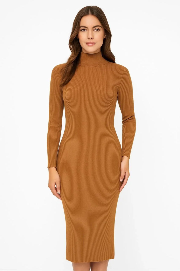 Kadın Boğazlı Triko Elbise – Uzun Fitilli Esnek Dokuma, Tam Kalıp, Kışlık & Baharlık Şık Rahat Stil, 130 cm Midi Boy Elbise - Kahverengi
