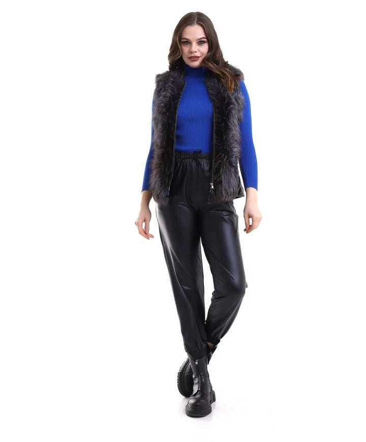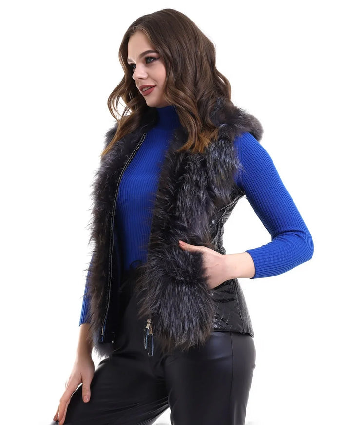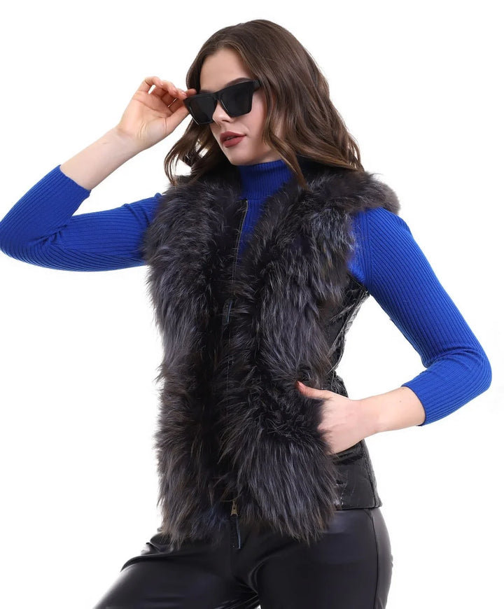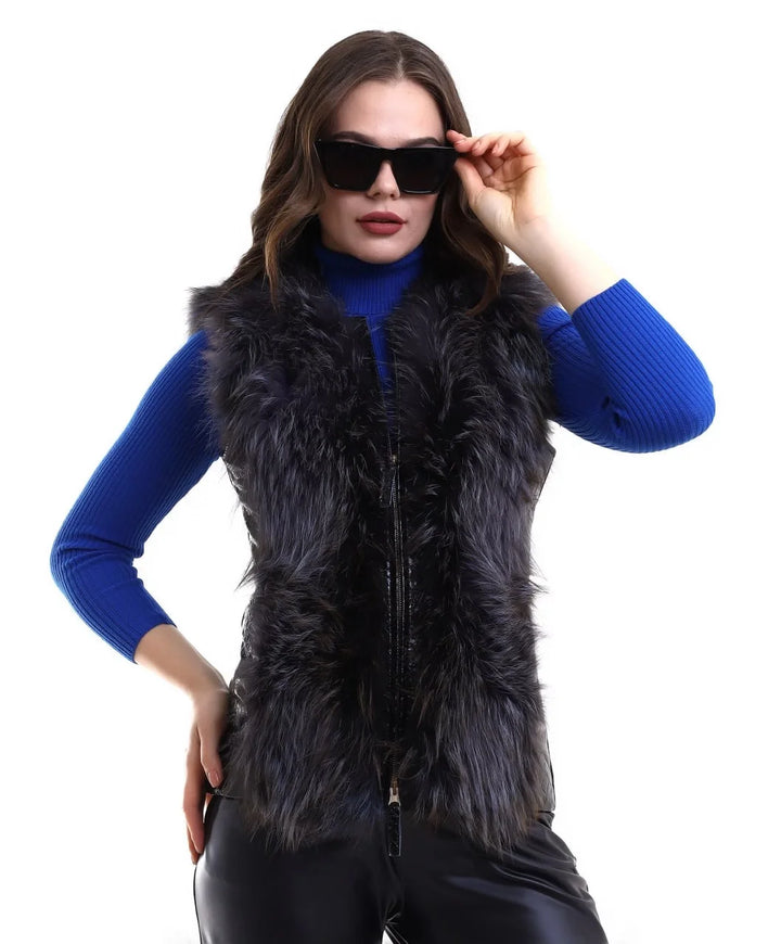 Kadın Fermuarlı Koyun Derisi Tilki Kürkü - Siyah