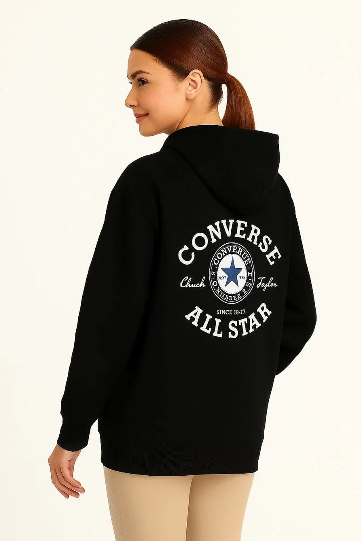 Kadın Kapşonlu Sweatshirt – Üç İplik Şardonlu Kumaş, Oversize Fit, Ön & Arka Baskılı, Kanguru Cepli, Kışlık Rahat Hoodie- Siyah
