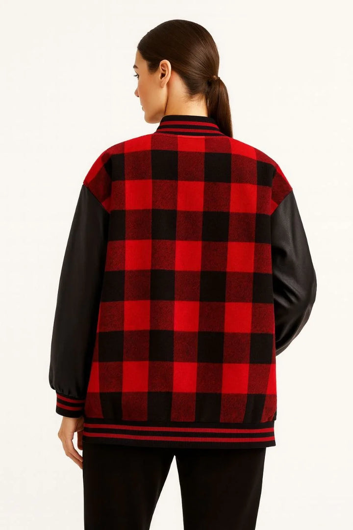Kadın Kolej Ceket – Kareli Oduncu Kumaş, Kolları Suni Deri, Fermuarlı, İçi Kapitone Astarlı, Nakışlı Oversize Bahar & Kış Stil - Bordo