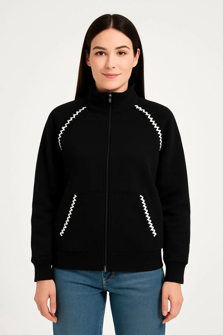 Kadın Oversize Dik Yaka Fermuarlı Sweatshirt - Zincir Nakışli Kanguru Cepli, - Siyah