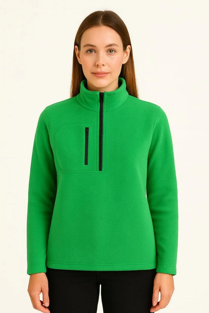 Kadın Polar Kazak – Dik Yaka, Yarım Fermuarlı, Fermuarlı Göğüs Cepli, Siyah Biyeli, Kışlık Rahat Regular Fit Günlük Model - Yeşil