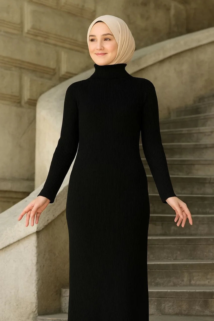 Kadın Tesettür Triko Elbise – Boğazlı Uzun Fitilli Dokuma, Esnek Tam Kalıp, 130 cm Midi Boy, Bahar & Kış Şık Rahat Stil - Siyah