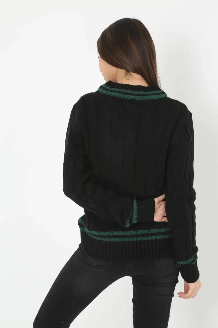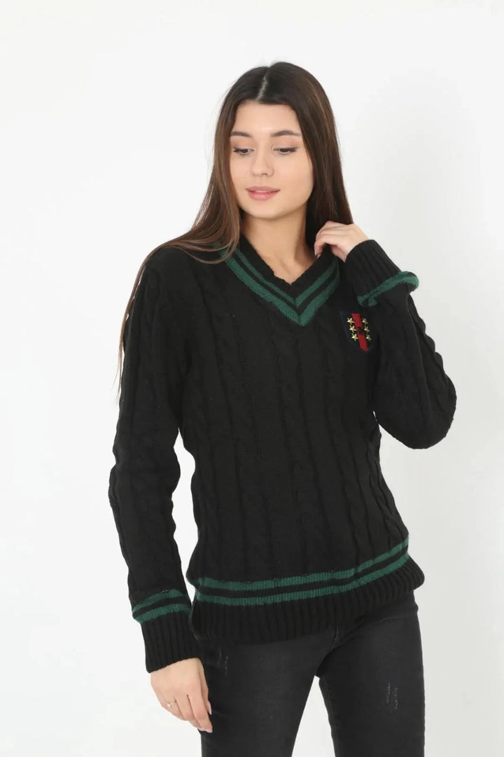 Kadın V Yaka Örgülü Kazak - Siyah
