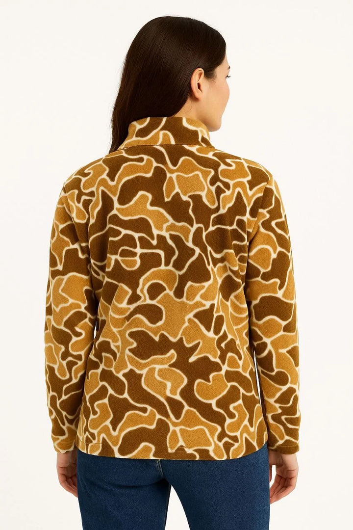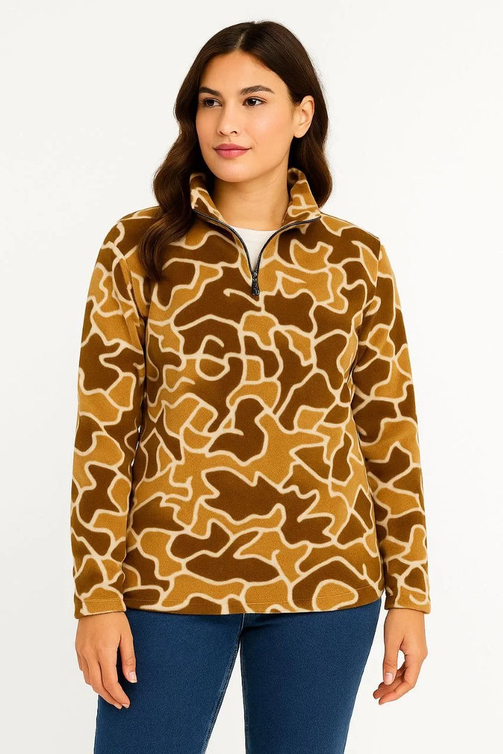 KADIN Yarım Fermuarlı Desenli Polar Sweat Yakalı, Uzun Kollu, Oversize Rahat Kalıp - Kahverengi