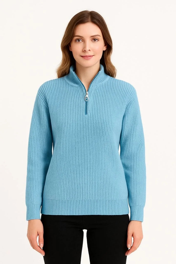 KADIN Yarım Fermuarlı Triko Kazak – Selanik Örgü, Dik Yaka, Pamuklu Dokuma, Oversize Uzun Kollu Kışlık Model - Bebe Mavisi