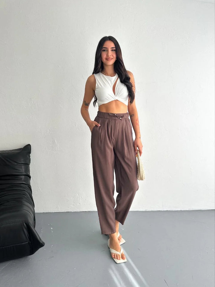 Kadın Yüksel Bel Rahat Boru Paça Pantalon - Kahverengi