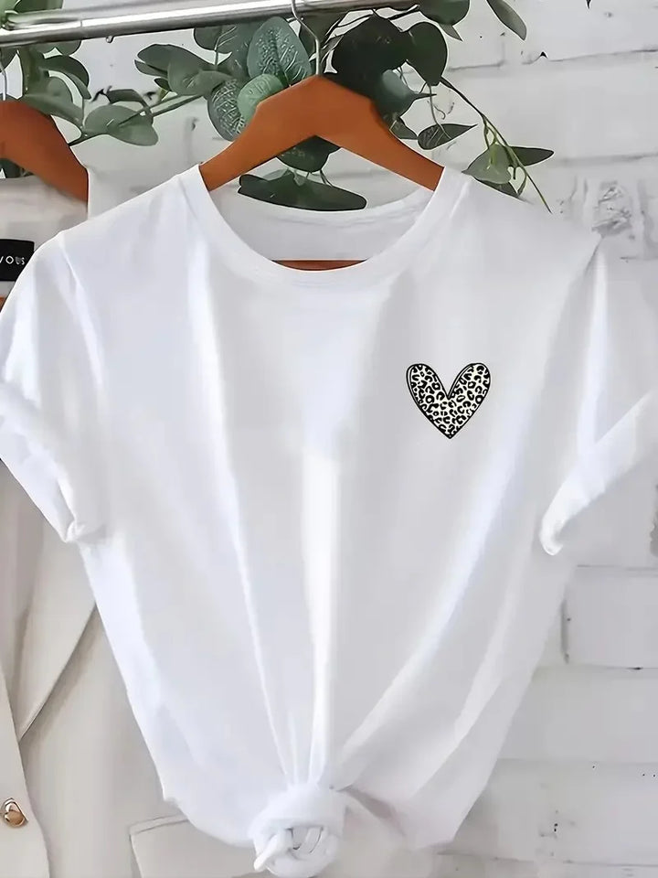 Kadınlar için Şık Leopar Kalp Baskılı Günlük Tişört - Büyük Beden, Makinede Yıkanabilir, Sevgililer Günü & Günlük Kıyafetler için Mükemmel- Beyaz