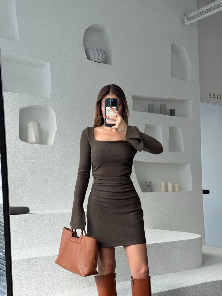Kare Yaka Mını Boy Fitilli Elbise - Füme