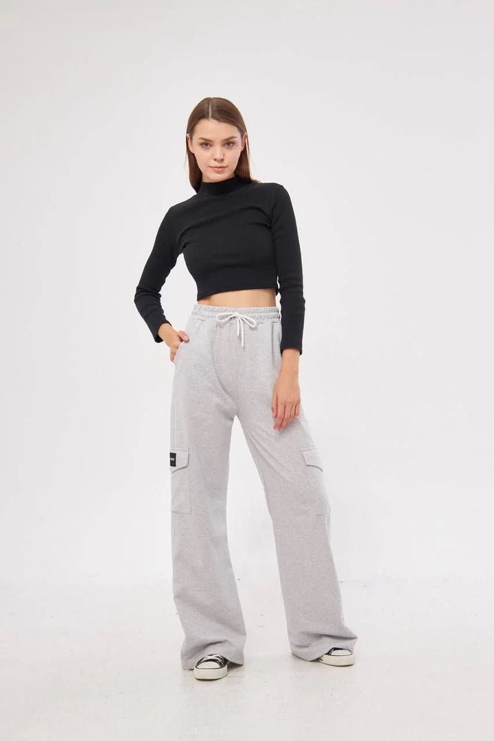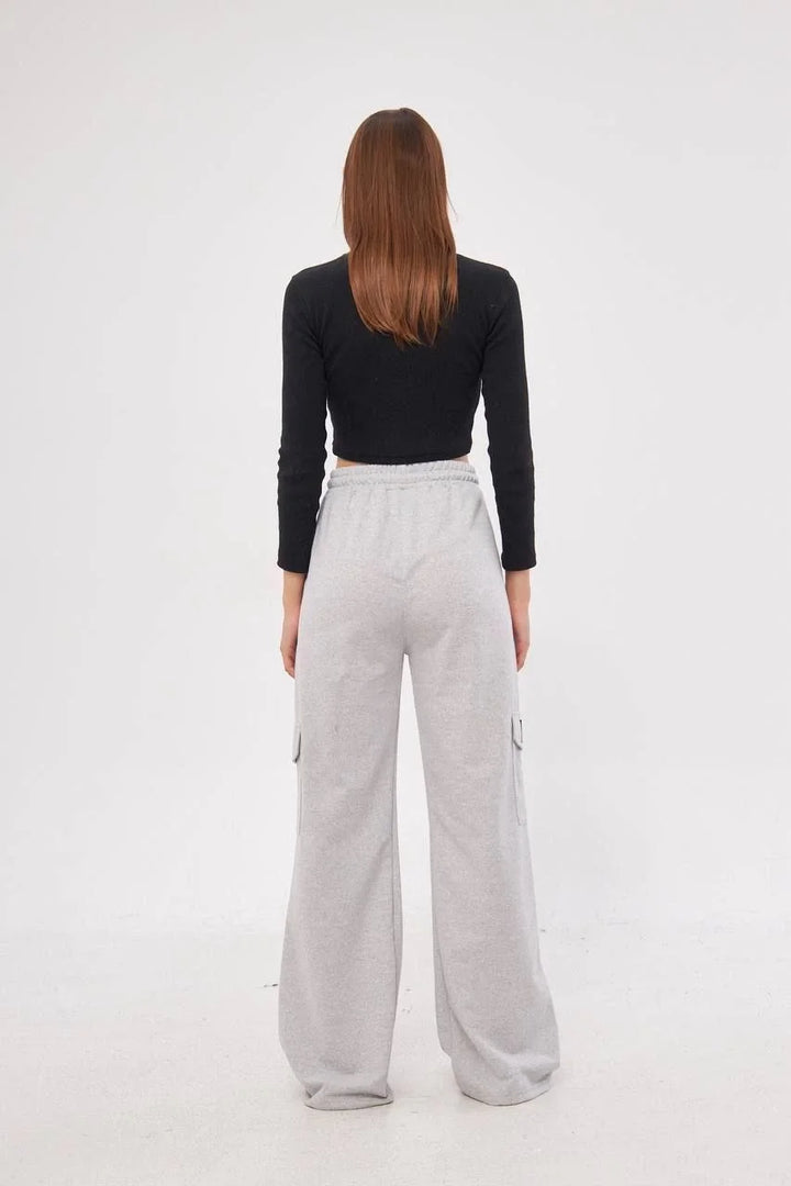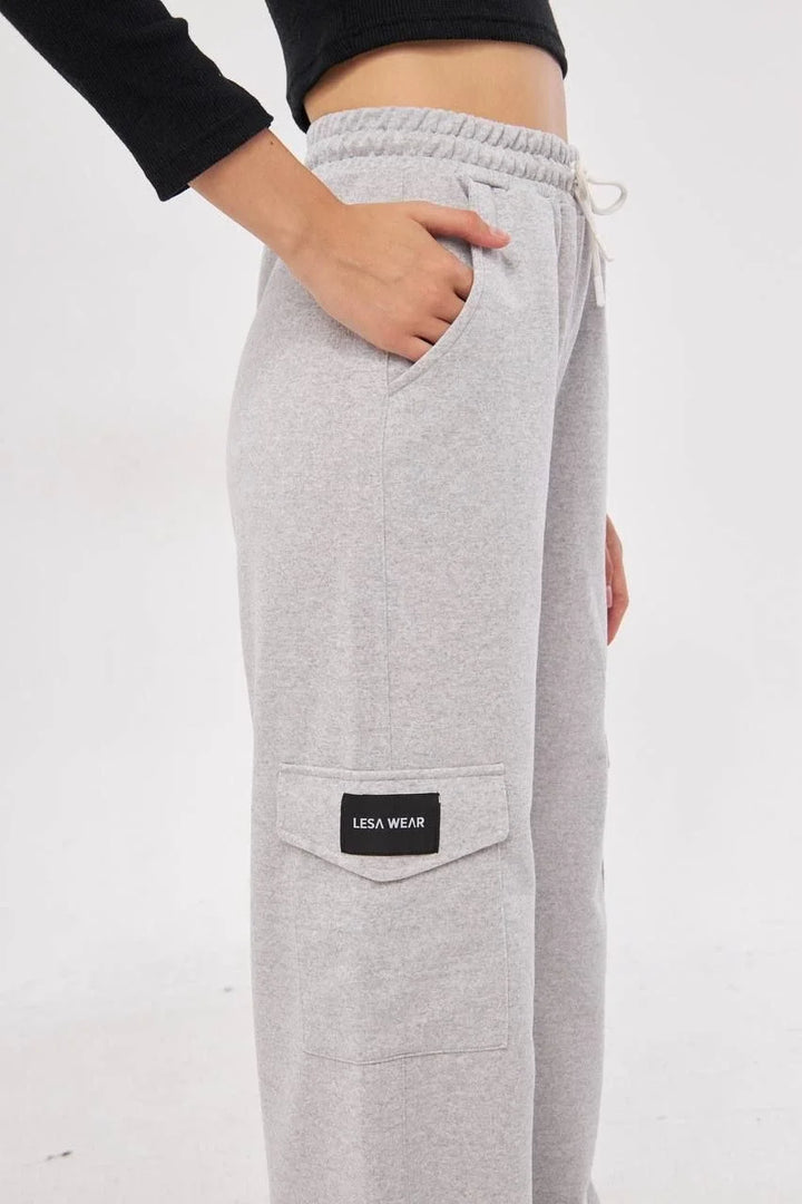 Kargo Cepli Palazzo Oversize Kesim İki iplik Bol Paça Eşofman Altı Pantalon - Gri