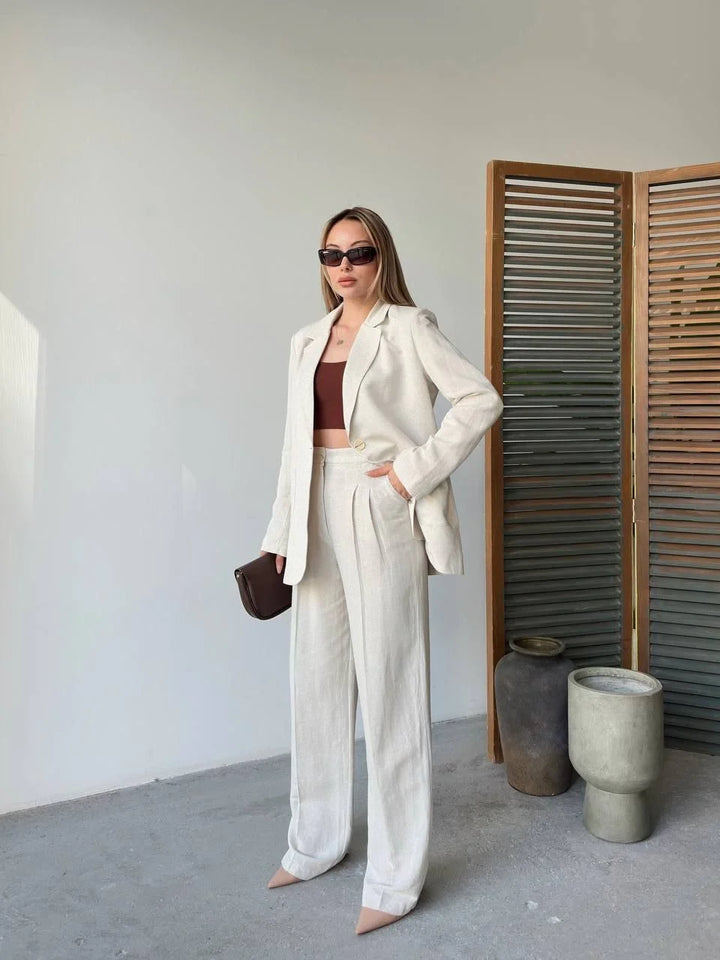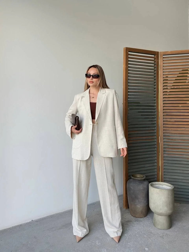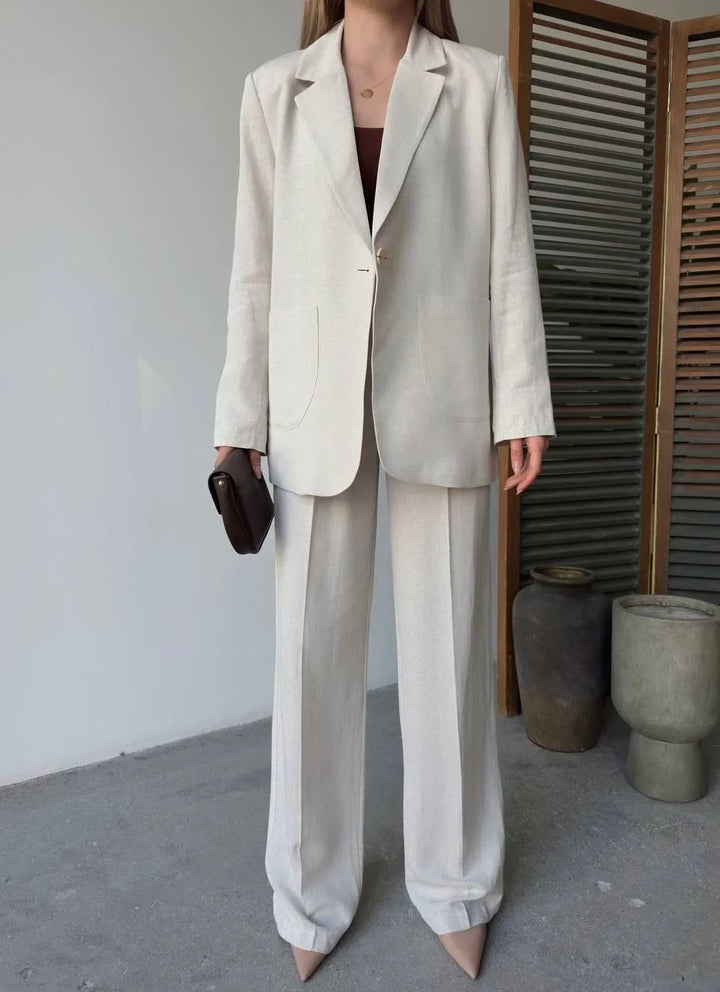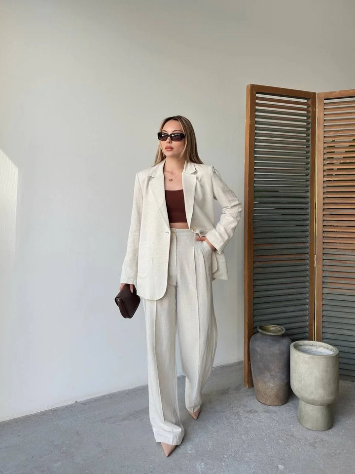 Keten Ceket Pantolon İlik Düğmeli Uzun Kollu Yırtmaçlı ikili Takım - Beyaz
