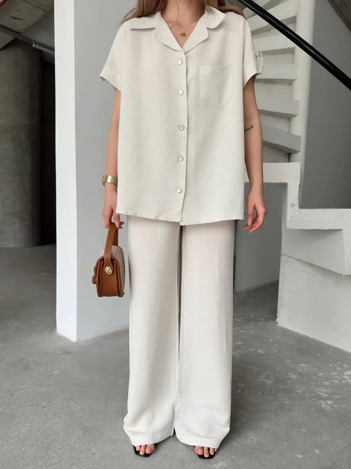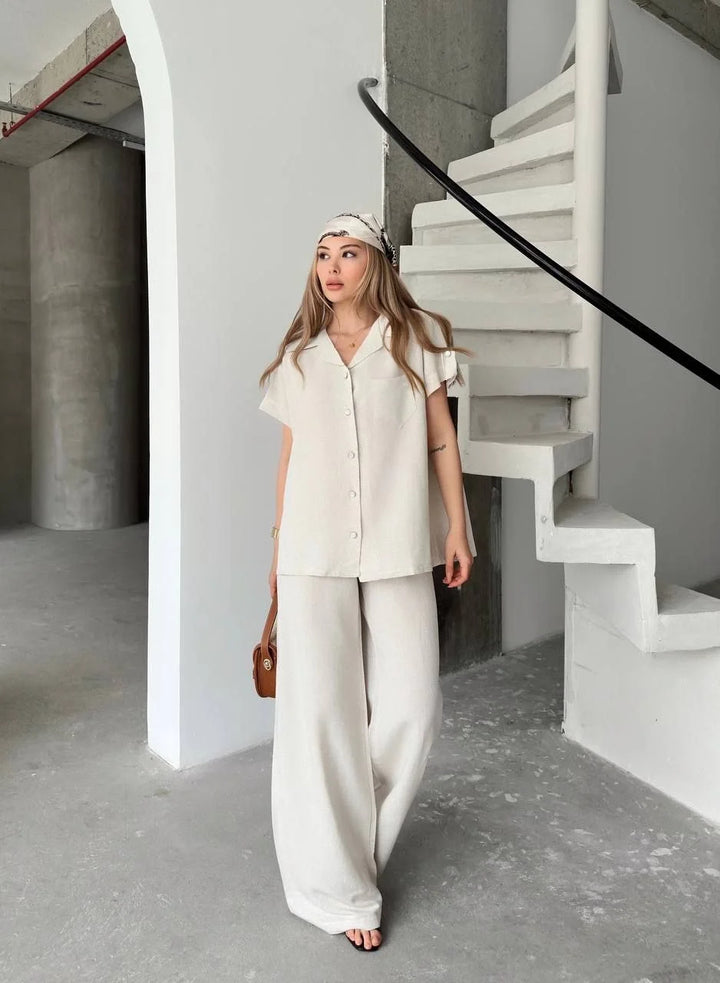 Keten Kısa Kollu Cepli Gömlek Pantolon ikili Takım - Beyaz