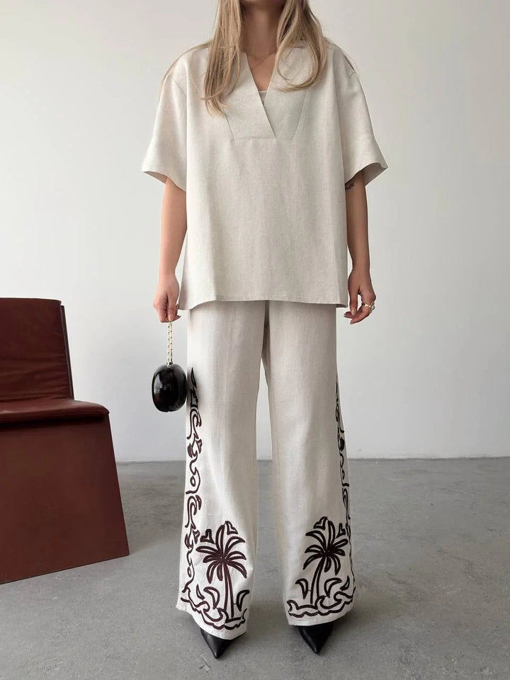 Keten Kısa kolu V Yaka Bluz Pantolon ikili Takım- Beyaz