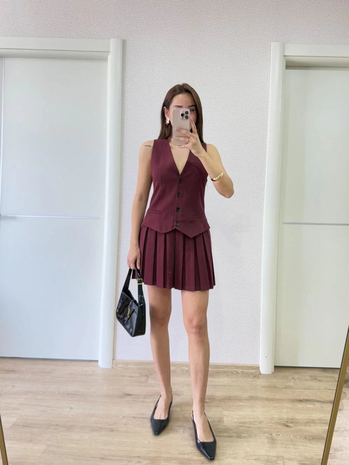 Keten Takım Görünümlü Düğme Detaylı Yelekli Mini Elbise - Bordo