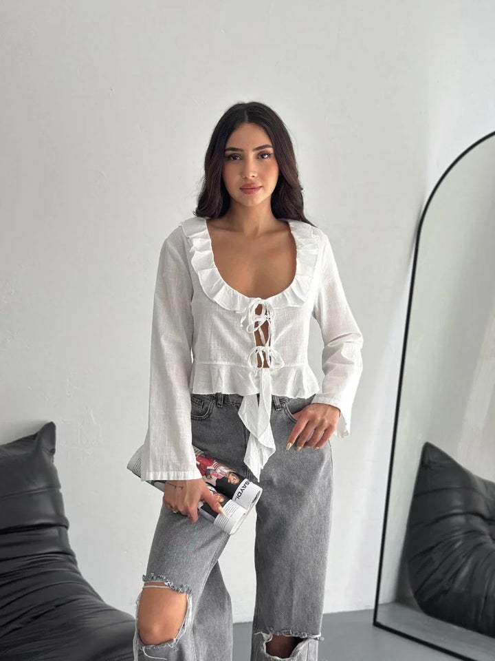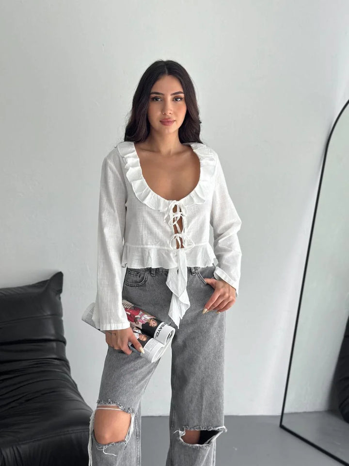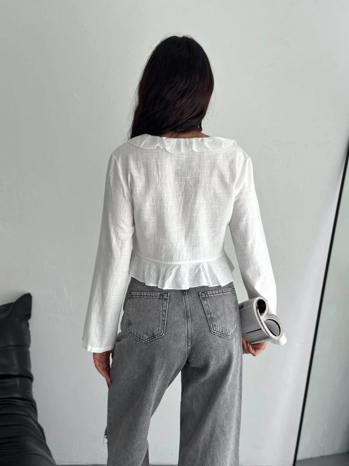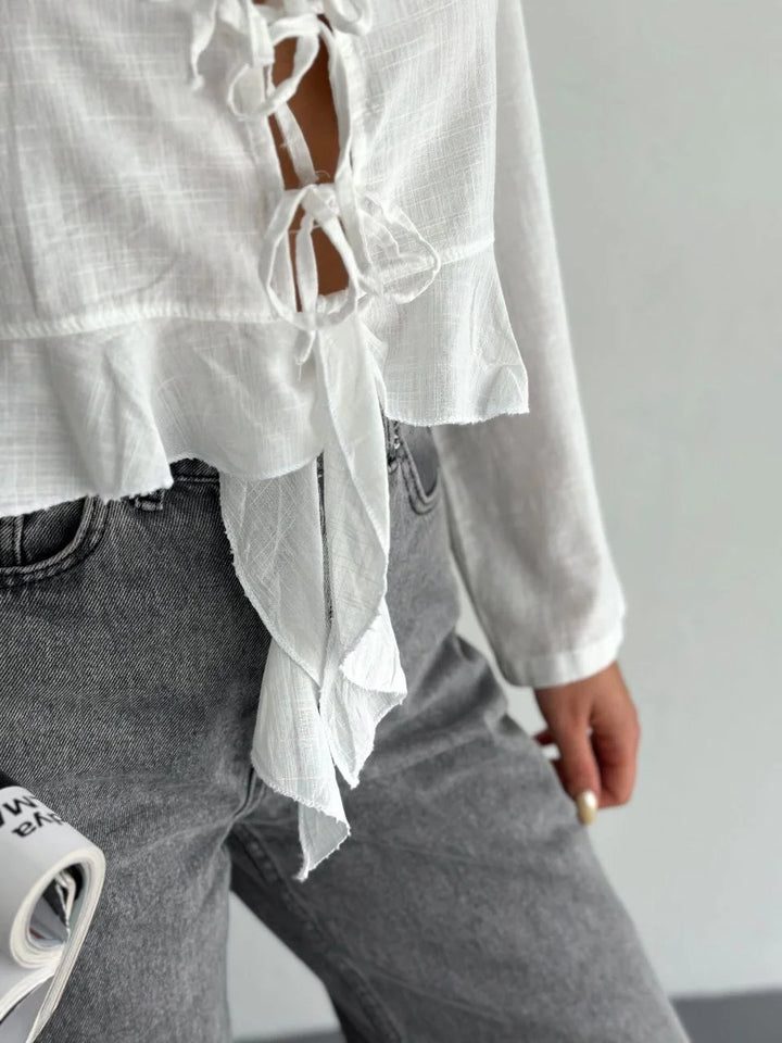 Keten Uzun Kol Bağacık Detaylı Bluz - Beyaz