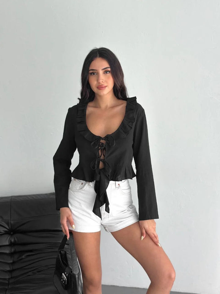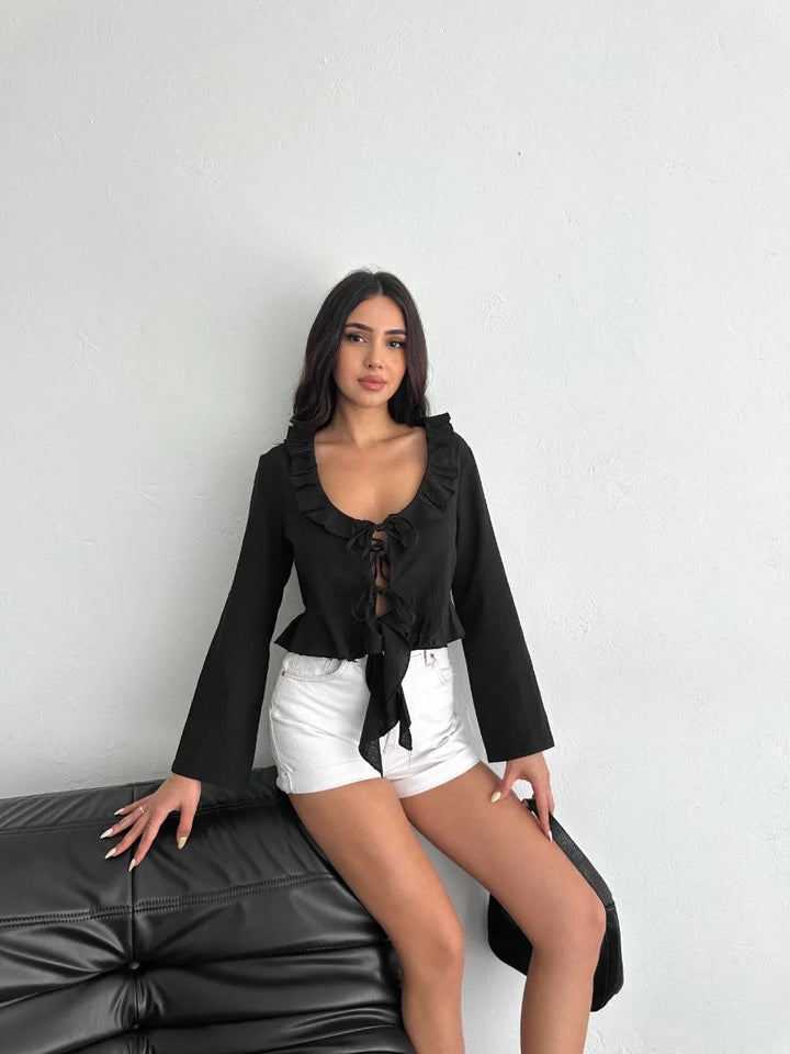 Keten Uzun Kol Bağacık Detaylı Bluz - Siyah