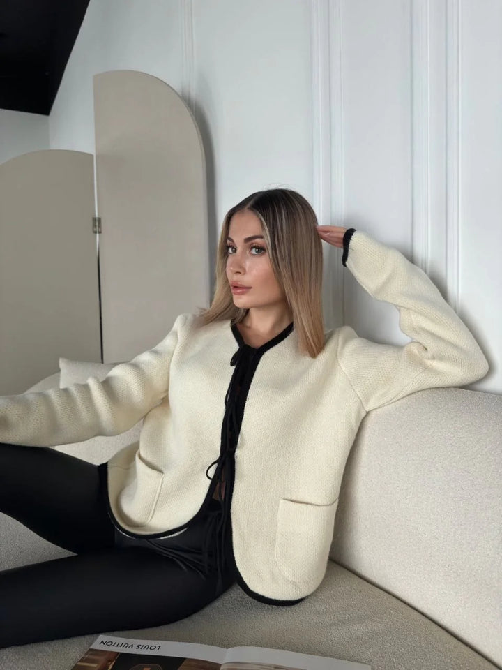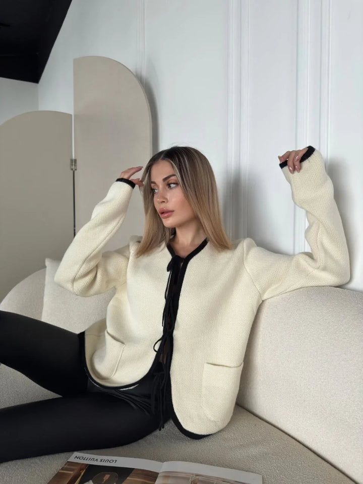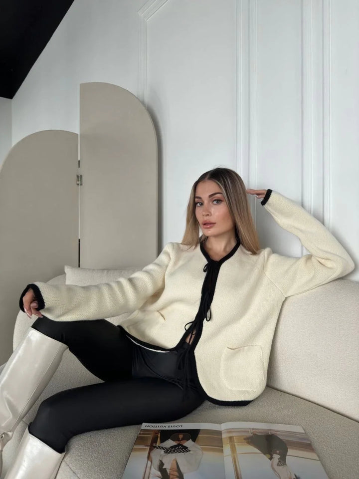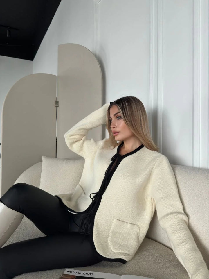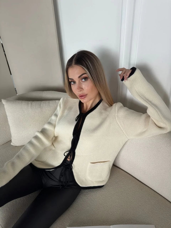 Kirli Beyaz Triko Siyah Detaylı Bağlamalı Önden Cepli Hırka