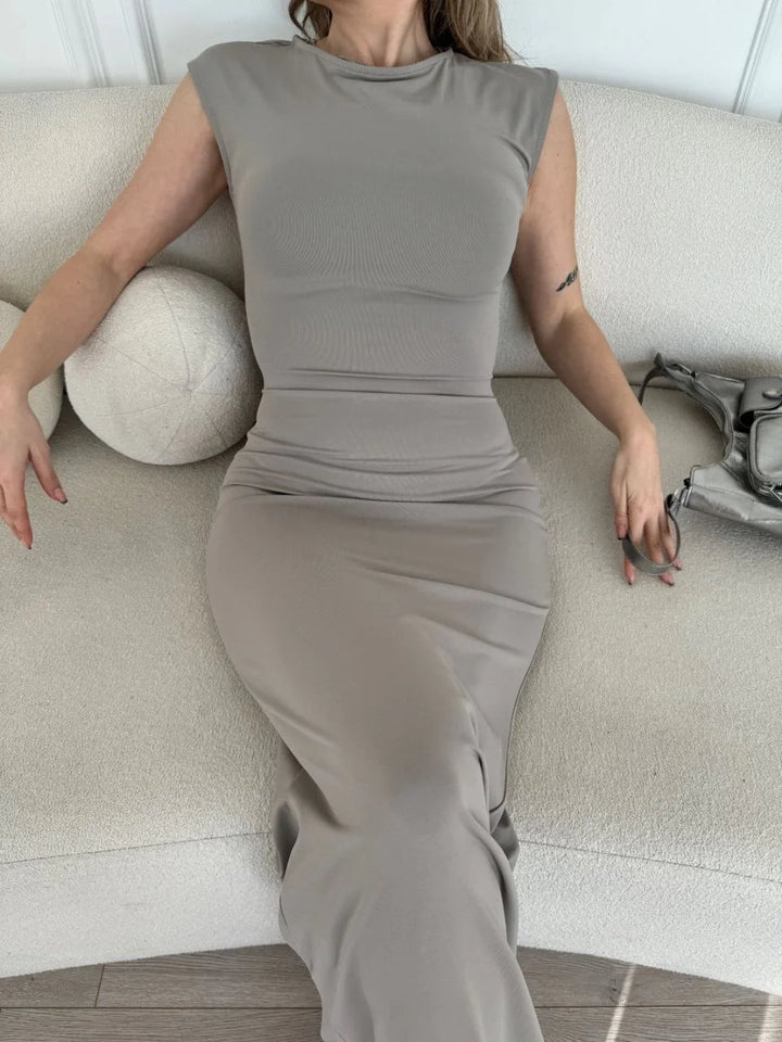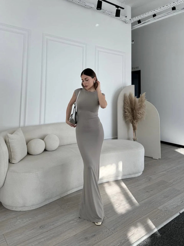 Kolsuz Uzun Likralı Elbise - Gri