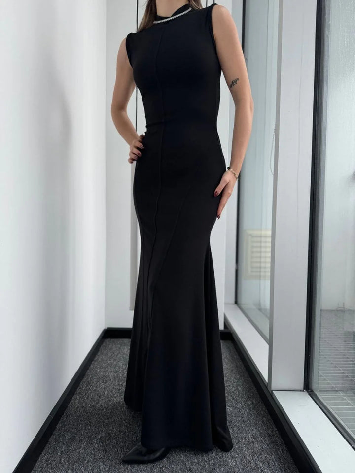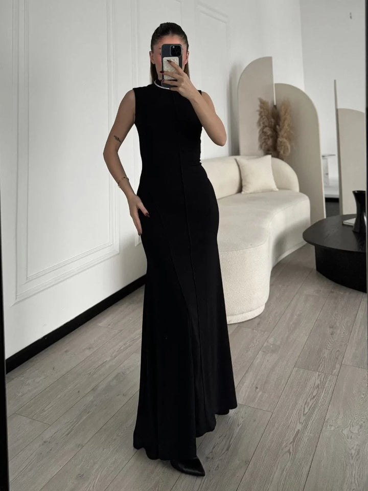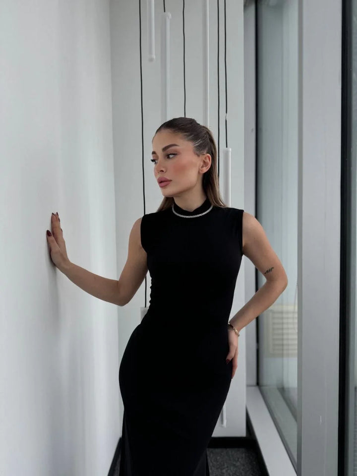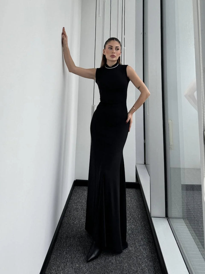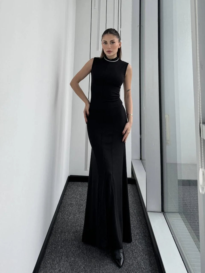 Kolsuz Yarım Bogazlı Uzun Elbise- Siyah