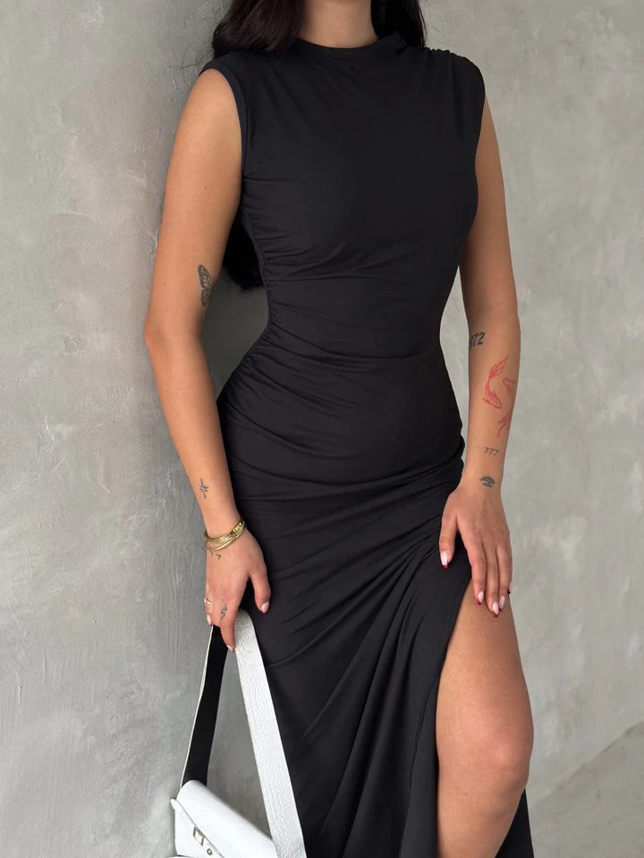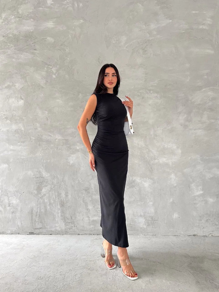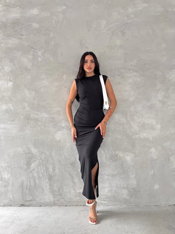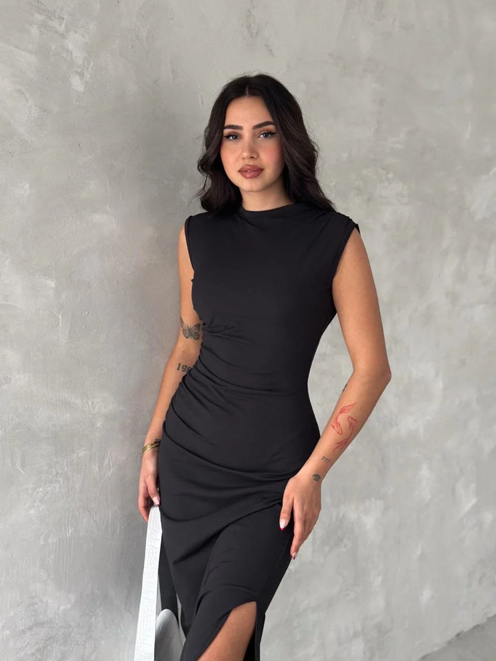 Kolsuz Yırtmaçlı Uzun maxı boy Elbise - Siyah