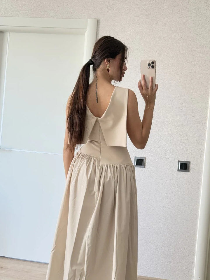 Krep Arkası Kanat Arka Ön Pens Detaylı Uzun Kadın Elbise - Bej