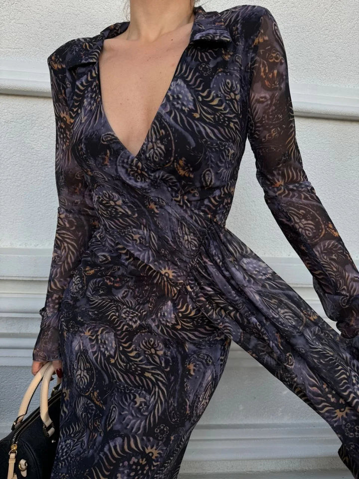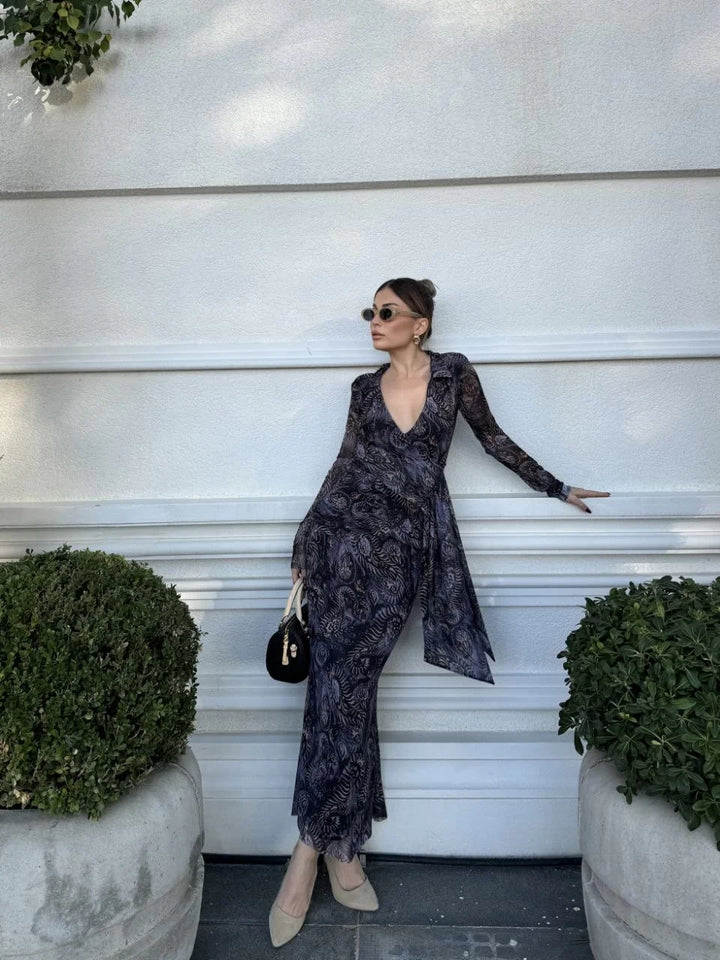 Kruvaze V yaka, fırfırlı ve bağcıklı Desenli Bluz ve Midi Etek Takım - Siyah