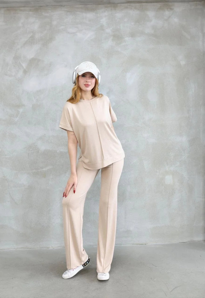 Osy Modal Yumuşak dokulu Kumaş Bisiklet Yaka Kısa Kollu Takım - Bej