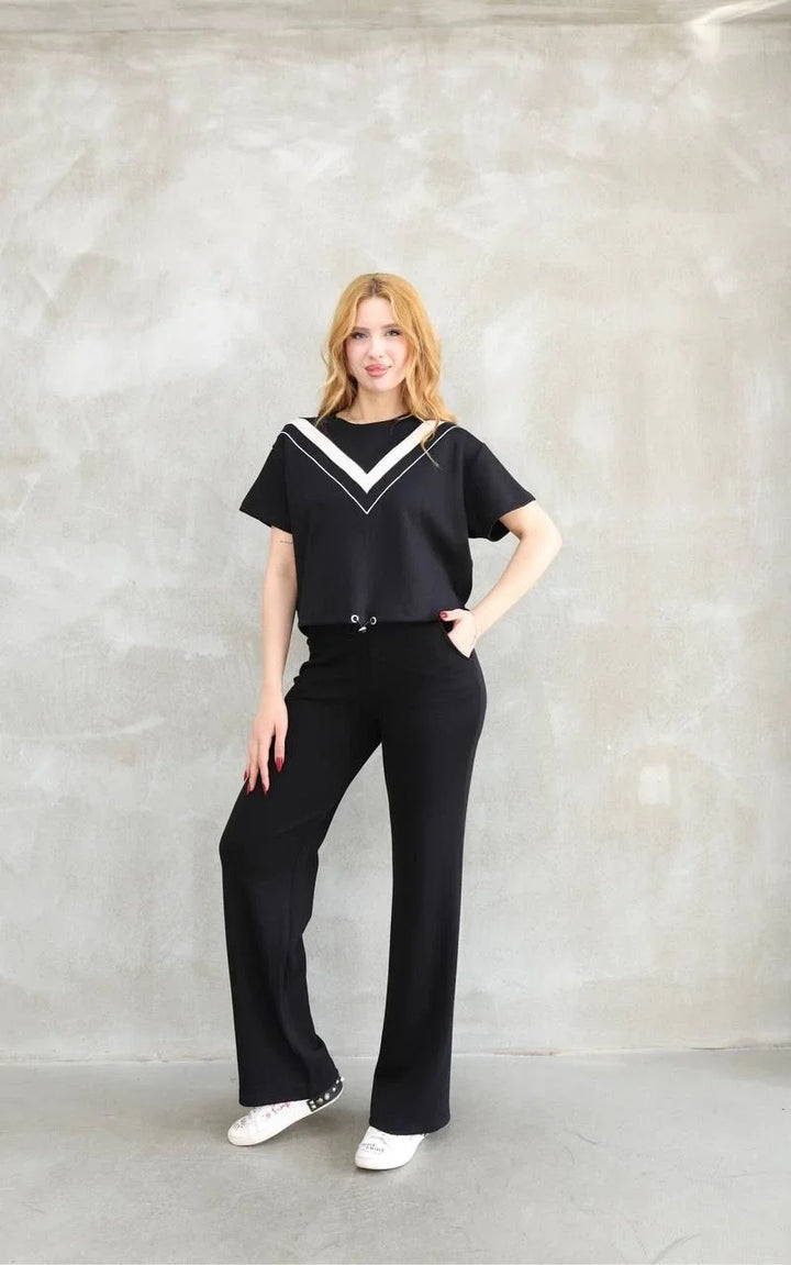 Osy Modal Yumuşak dokulu Kumaş Bisiklet Yaka Parçalı detaylı Kısa Kollu Takım - Siyah