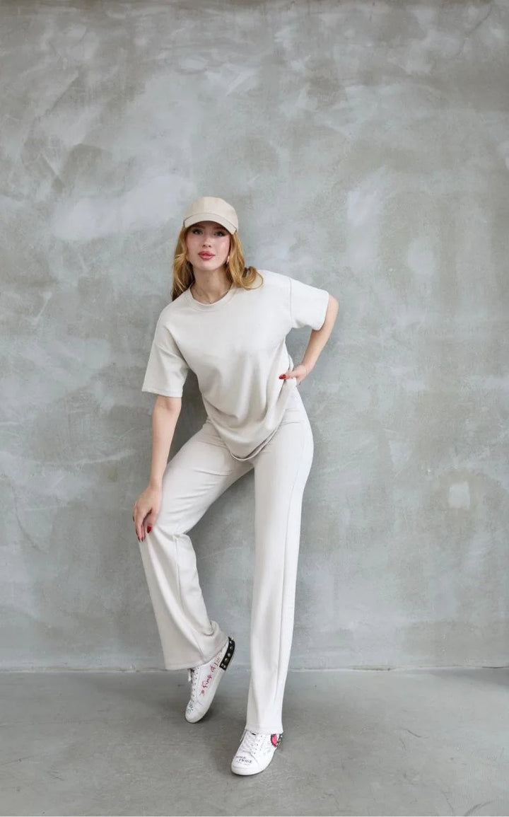 Osy Modal Yumuşak dokulu Kumaş Bisiklet Yaka Taş detaylı Kısa Kollu Takım - Kırık Beyaz