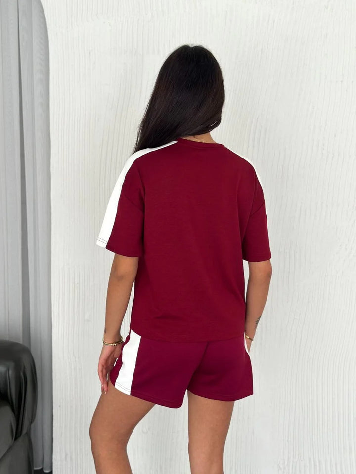 Osy Modal yumuşak dokulu Kumaş Kadın Parçalı Bisiklet Yaka T-shirt Kısa Şort İkili Takım - Bordo