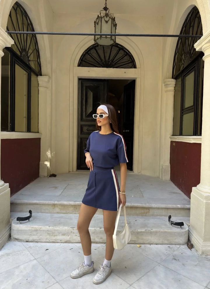 Osy Modal yumuşak dokulu Kumaş Kadın Parçalı Bisiklet Yaka T-shirt Mini Şortlu Etek İkili Takım -Lacivert