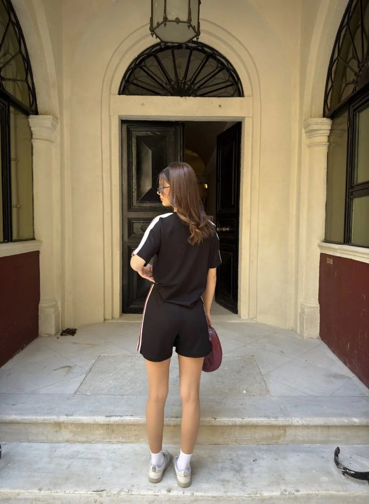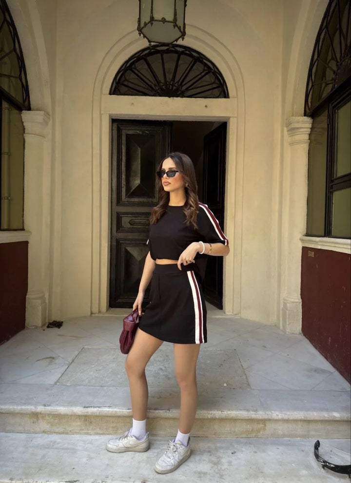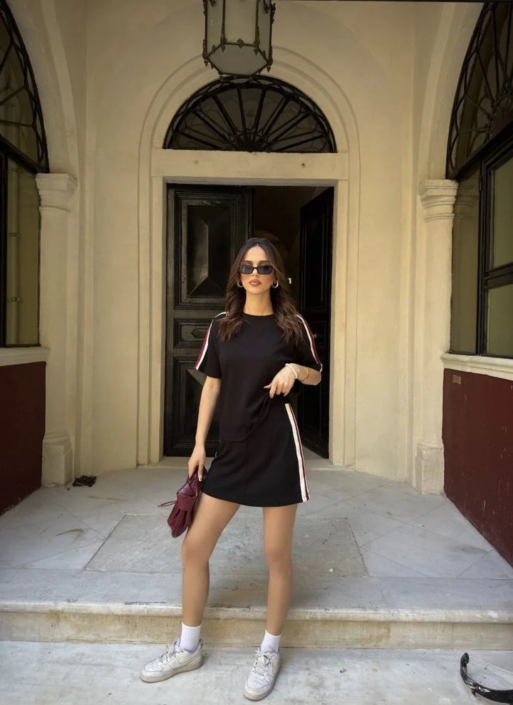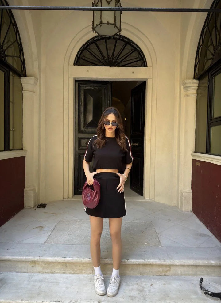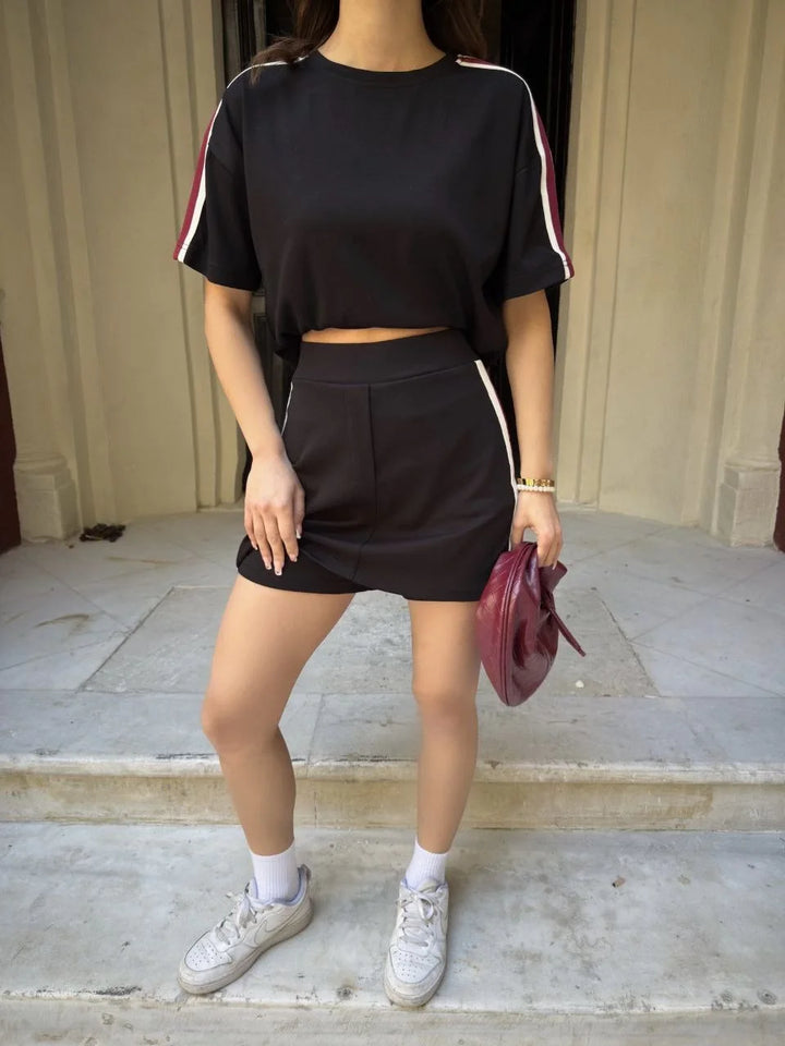 Osy Modal yumuşak dokulu Kumaş Kadın Parçalı Bisiklet Yaka T-shirt Mini Şortlu Etek İkili Takım - Siyah