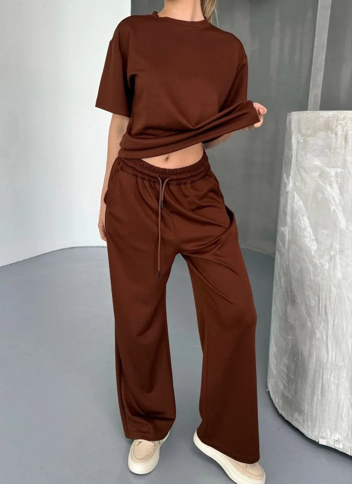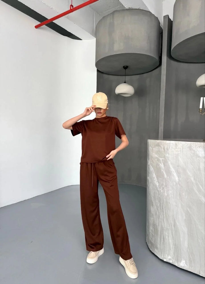 Osy Modal Yumuşak Dokulu Kumaş Kısa Kollu Bluz Rahat Pantalon ikili Takım- Kahverengi