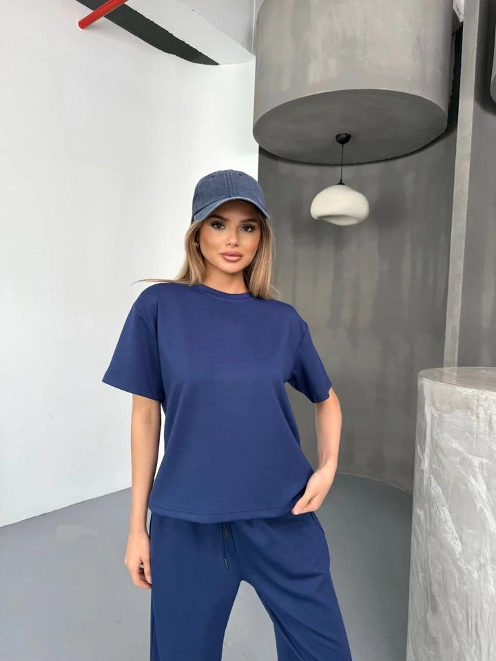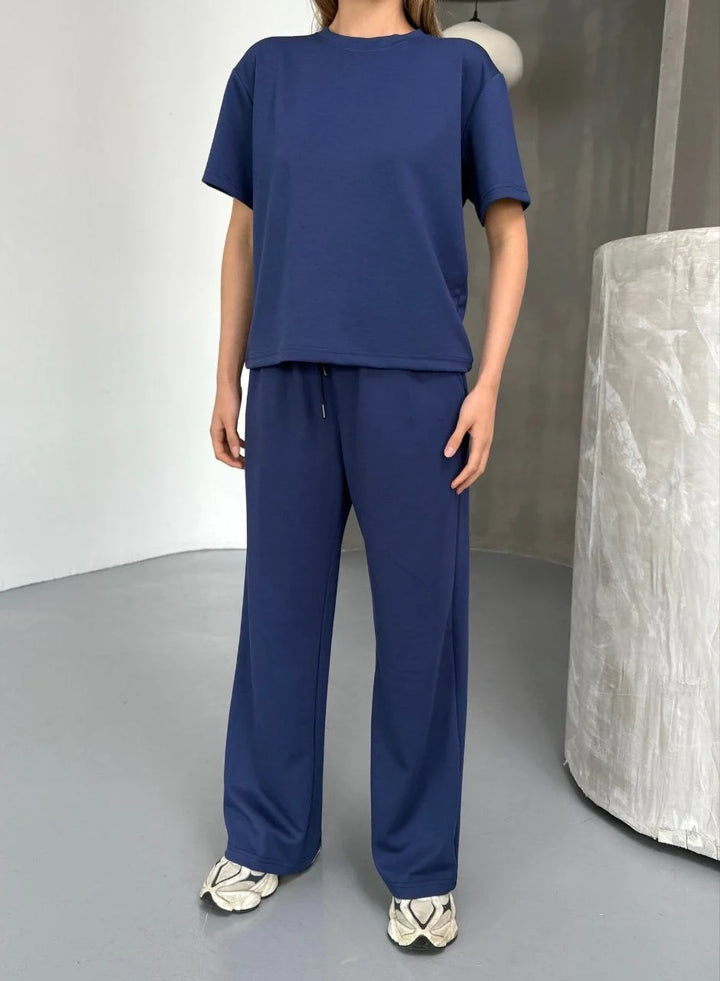 Osy Modal Yumuşak Dokulu Kumaş Kısa Kollu Bluz Rahat Pantalon ikili Takım- Lacivert