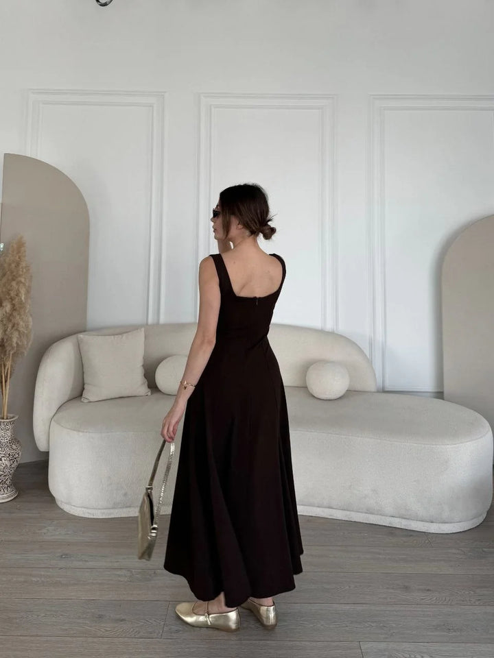 Sırt Dekolteli Kolsuz Uzun Elbise - Kahverengi