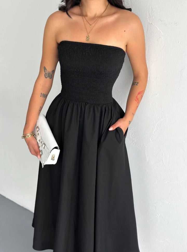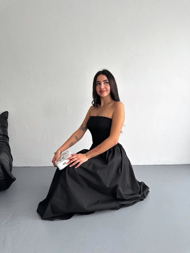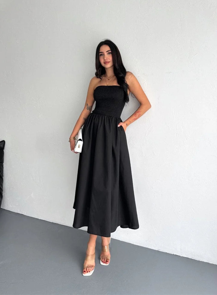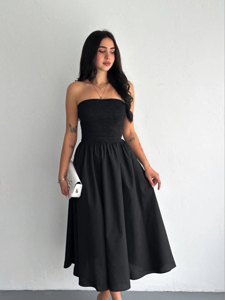 Straplez Pileli Elbise - Siyah