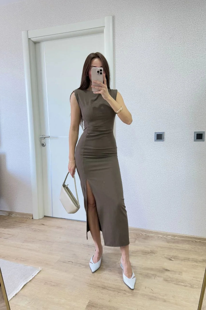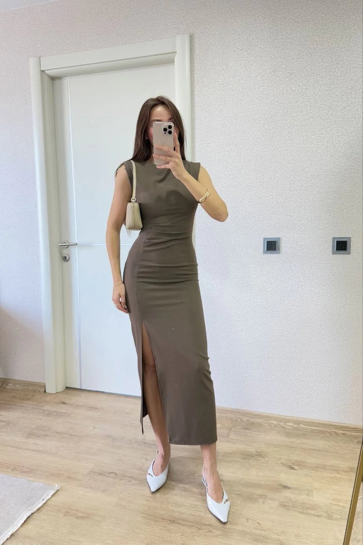 Yırtmaç Detaylı Sırtlı Kapalı Yandan Derin Yırtmaç Detaylı Kolsuz Elbise - Antrasit